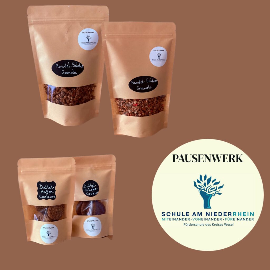 Unter dem Namen Pausenwerk entstehen gesunde, nachhaltige und selbstgemachte Snacks, wie zum Beispiel Granola und Dattel-Hafer-Cookies.